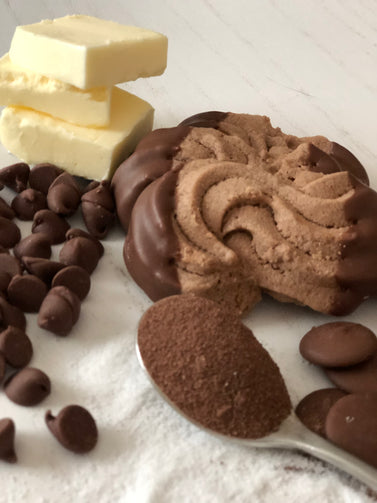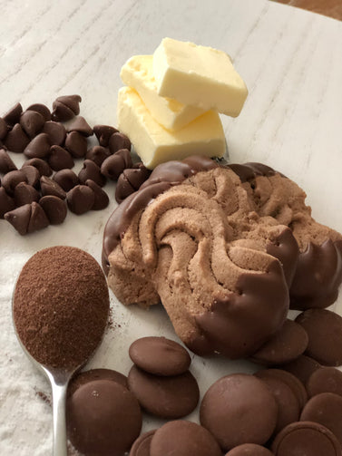 This is the brother of my ‘Blonde’ cookie. A soft, buttery, chocolate cookie with ends that are dipped in dark chocolate. Try it with your afternoon coffee, a glass of milk or just on its own.