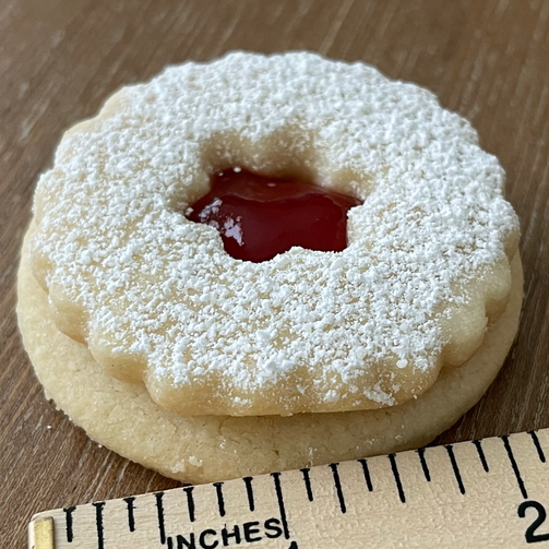 A tasty homemade shortbread cookie, filled with a variety of different jams,( strawberry, raspberry, peach, blackberry) or chocolate, sprinkled with confectioner's sugar. A wonderful treat with a hot cup of coffee, tea, a glass of milk…….or just like that.